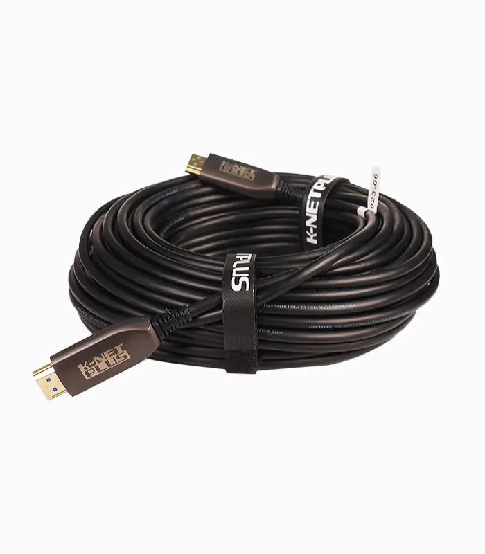 کابل HDMI 2.1 فیبر نوری کی نت پلاس مدل HDMI FIBER OPTIC CABLE KNET PLUS KP-CHAOC21500 50m، پهنای باند ۴۸ گیگابیت بر ثانیه، و پشتیبانی از رزولوشن 8K@60Hz و 4K@120Hz. انتخابی ایده‌آل برای انتقال سیگنال با کیفیت بالا در فواصل طولانی.
