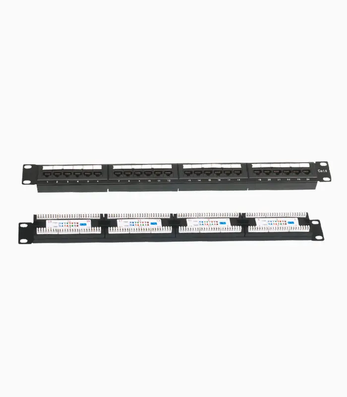 روش نصب یا استفاده ساده: نصب با پیچ در رک، اتصال کابلهای UTP به پورتهای پنل در جلو و مدیریت کابل در پشت