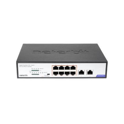 سوئیچ unmanaged SWITCH Neterbit NGS-F1010P-A با ۸ پورت PoE و ۲ پورت آپلینک گیگابیتی، مناسب برای تأمین برق و اتصال تجهیزات شبکه با نصب آسان.